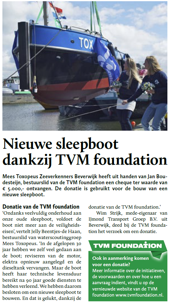 Beverwijk – Deze week heeft Jelly Beentjes-de Haan, bestuurslid van Mees Toxopeus Zeeverkenners Beverwijk, een cheque ontvangen ter waarde van 5.000 euro van de TVM foundation. Jan Boudesteijn, bestuurslid van de TVM foundation reikte de cheque uit. De donatie is gebruikt voor de bouw van een nieuwe sleepboot.